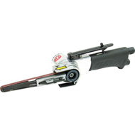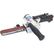 Suitable for shaping, paint removal, weld sanding, smoothing and rust removal on flat or curved surfaces. Supplied with 9 flexible abrasive belts and 5 contact arms. Rated for continuous use. Uses 6, 10, 13 and 20mm wide by 457mm long abrasive belts. Adjustable multi-positional sanding arm angle with a speed regulator and rear handle exhaust with noise baffler.